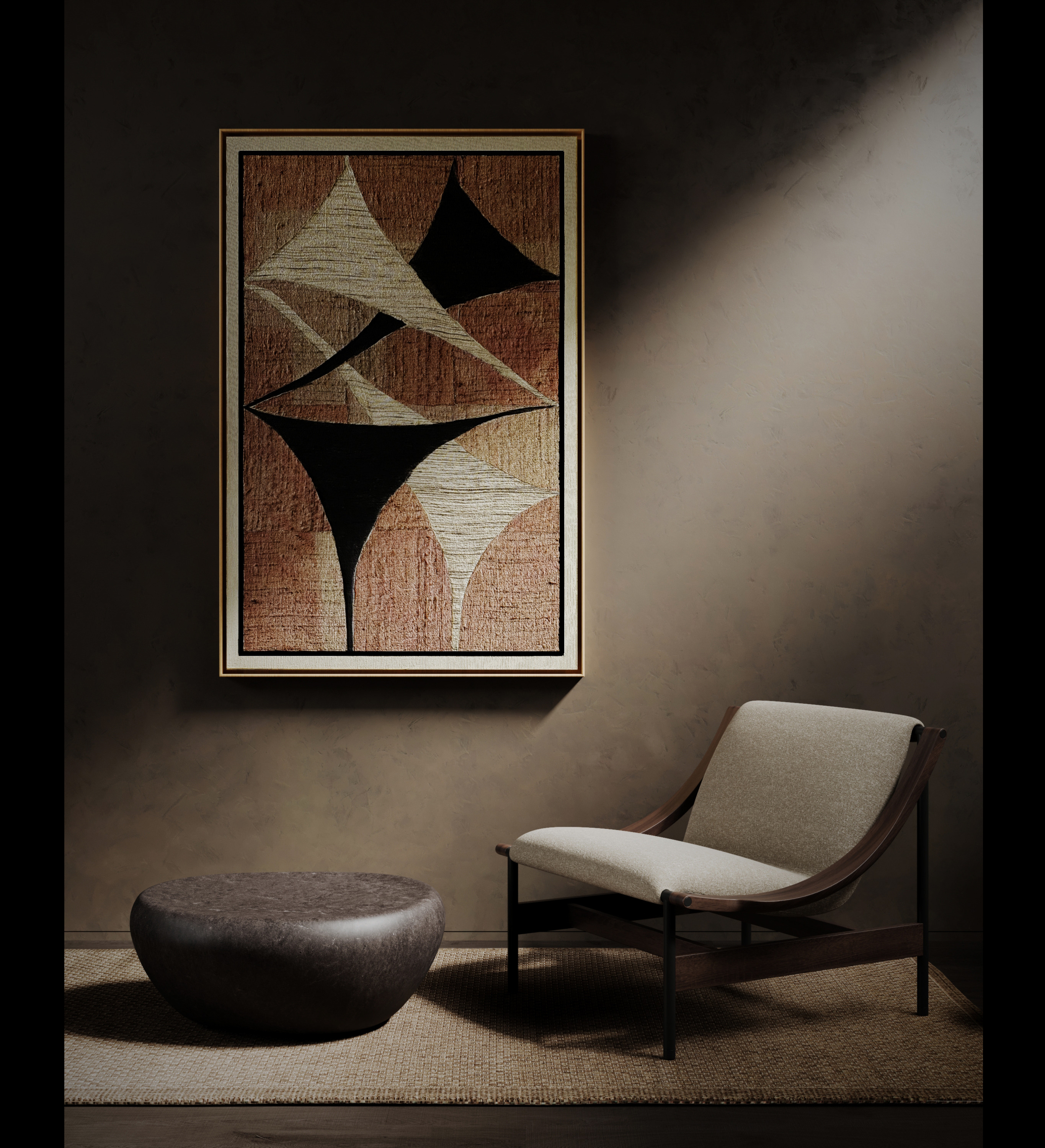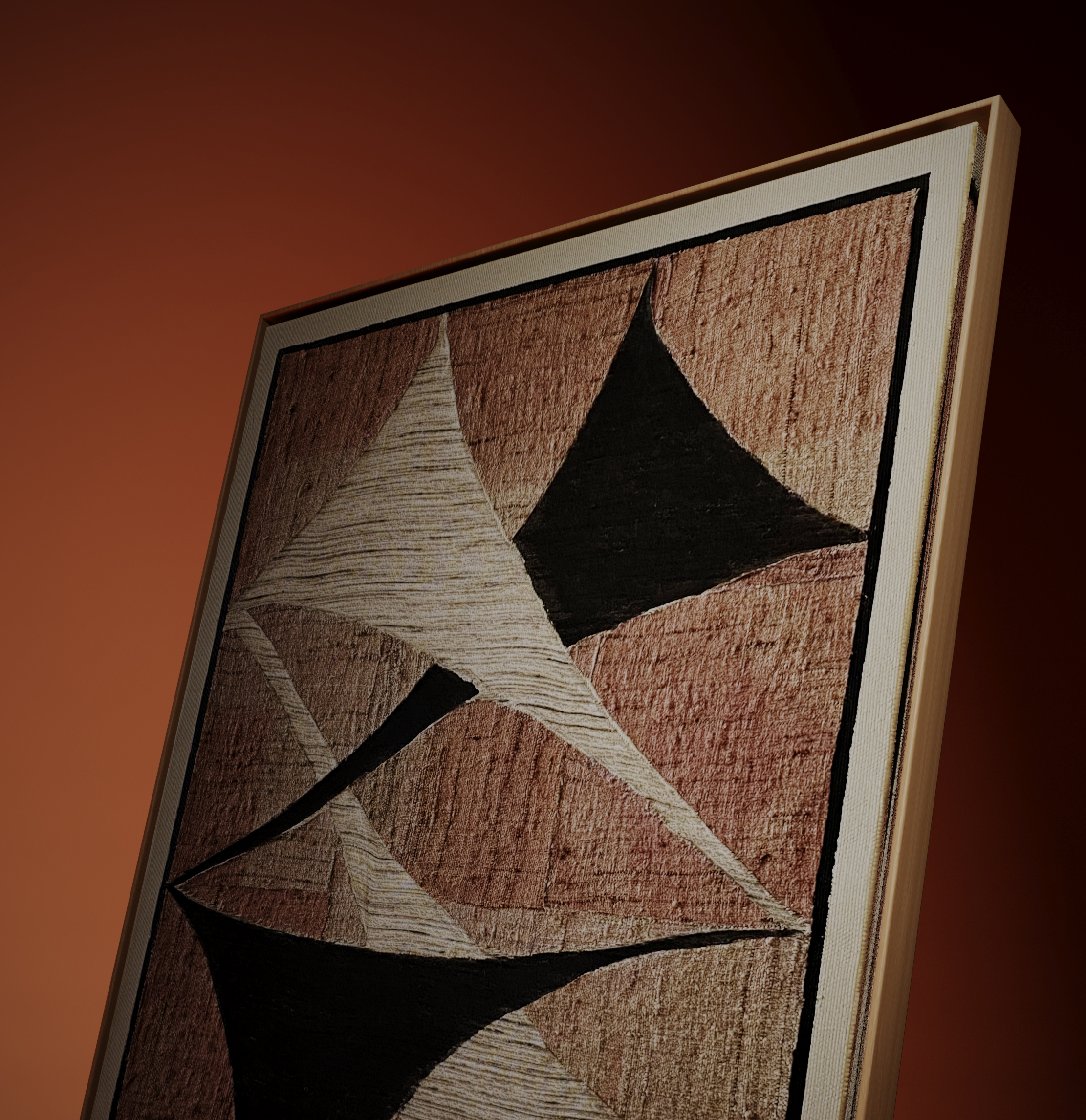 This abstract painting from Torn blends natural textures with bold geometric forms, creating a striking balance between modern minimalism and artisanal warmth. Crafted on handwoven fabric, the earthy tones of brown, beige, and black interact with raw, textured fibers, making each piece uniquely alive. The dynamic triangular shapes evoke movement and harmony, while the natural irregularities of the fabric ensure that no two artworks are ever the same.