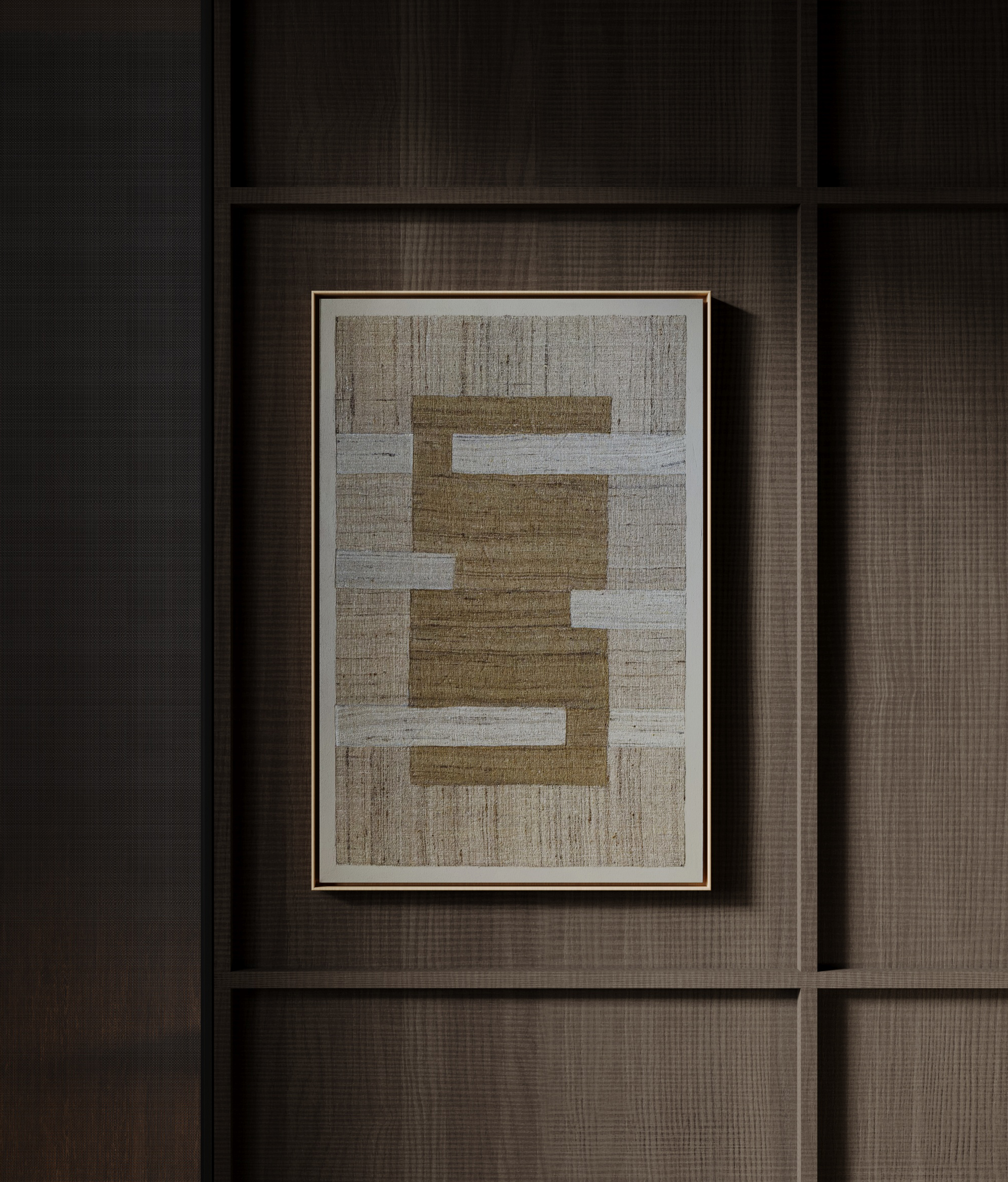 ο»ΏCollage with pieces of handwoven silk glued on canvas.