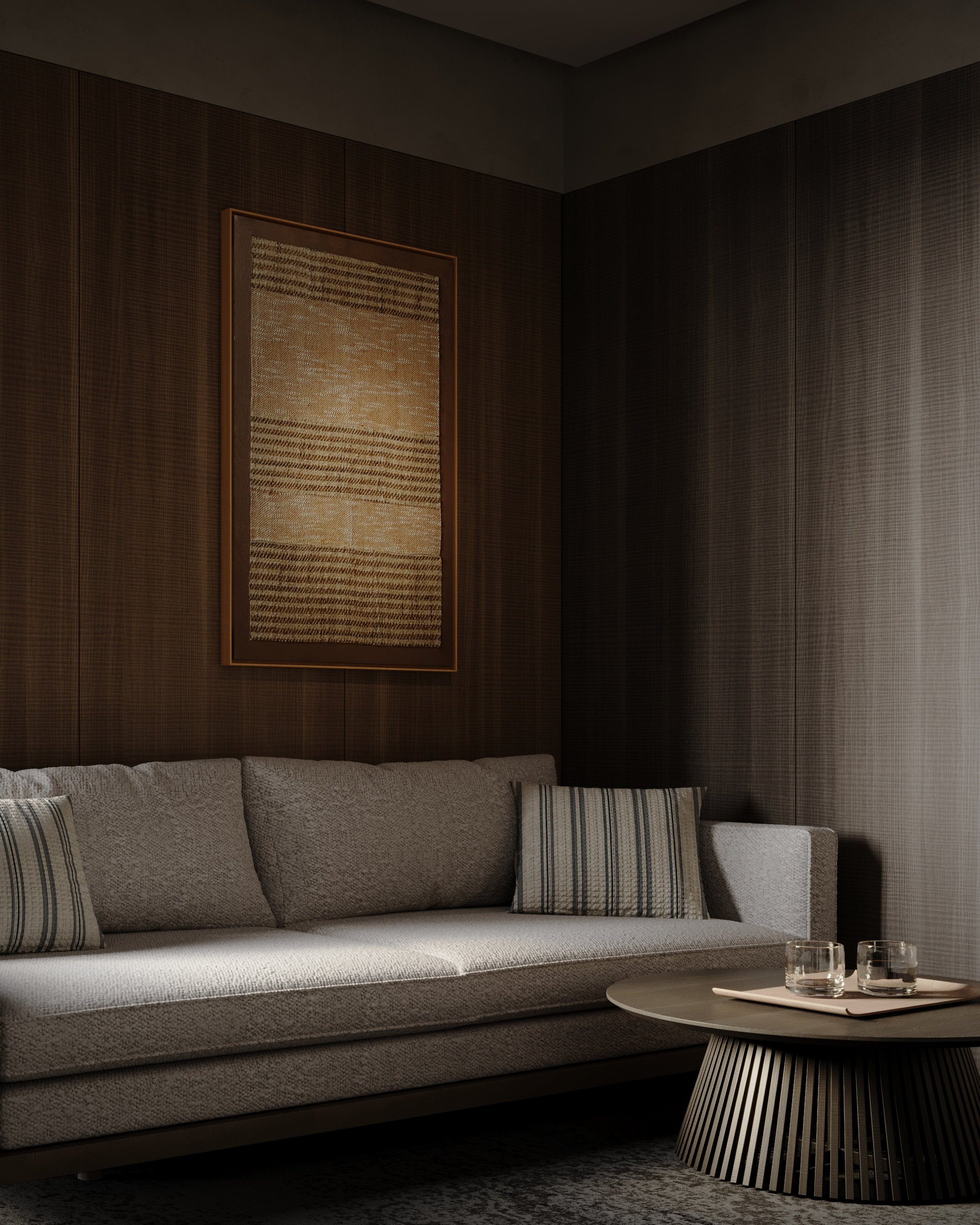 Discover the subtle beauty of natural textures with this handcrafted piece. Made from 100% natural ramie fiber, the artwork combines two tones of handwoven ramie fabric, creating a harmonious contrast of soft beige and earthy stripes. Encased in a minimal wooden frame, this piece blends rustic charm with modern elegance, perfect for adding warmth and texture to any interior. Each panel is meticulously woven by hand, making every artwork unique.